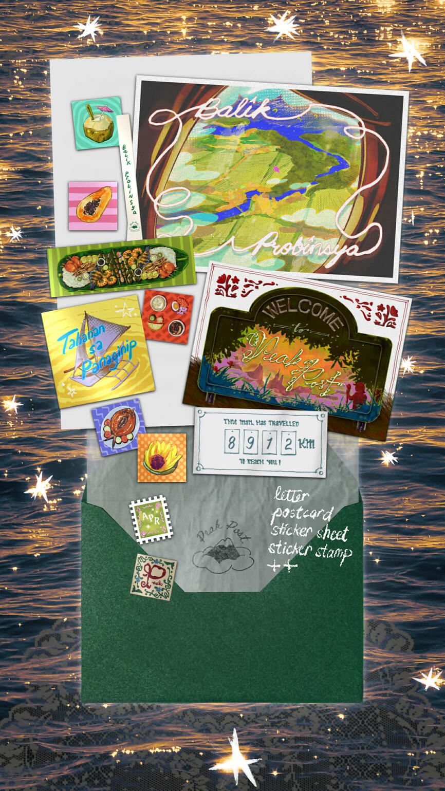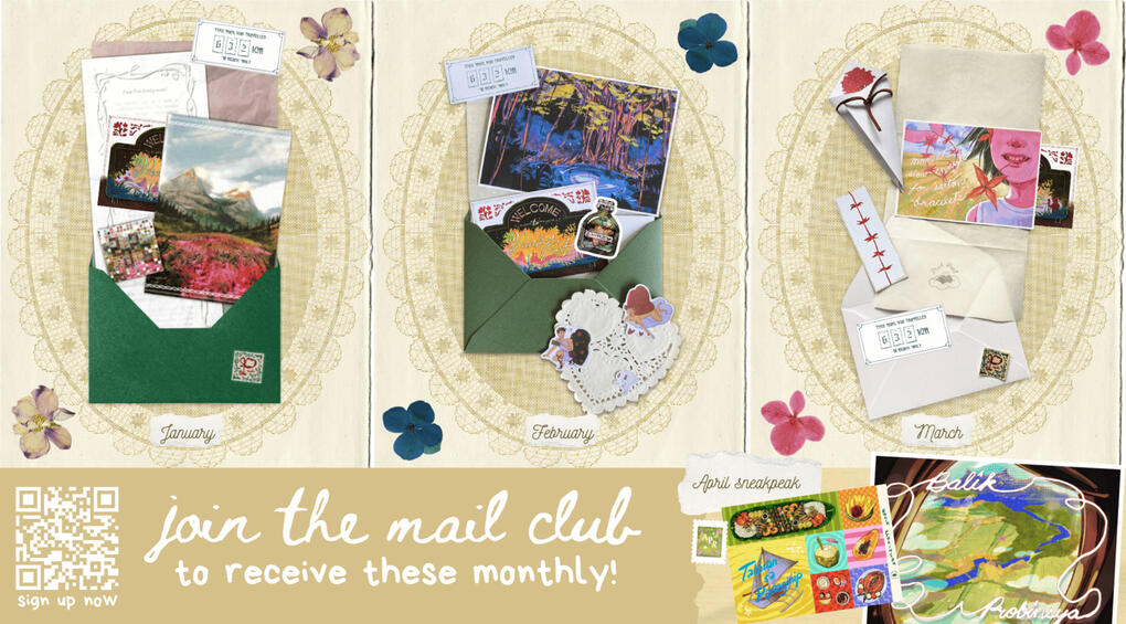 Hi, I'm Peon! I'm an architectural apprentice by day, and a digital fan artist by night from the Philippines, and I LOVE postcards. I'm the creator of Snail Mail Club: Peak Post all about landscape sceneries. Every month, little pieces of life finds its way to you in the form of a postcard, a letter, and a mystery art piece!Back in 2016, I had the opportunity to mail myself a postcard from the US. My cousin who had asked for a souvenir didn't request for anything but a 50 cent postcard to be mailed back, and for some reason she wanted it mailed not to her, but to me. Fate tells me that I guess it was supposed to work out that way. There's something endearing about rereading that small fragment of the past from the future. The postcard and its art makes it even more memorable, adding a little context of its own. Ever since then, whenever I can, I try to make time for a trip down to the post office during my travels with a short note for my future self written on a cheap postcard in my hand.Through this snail mail club, I hope to share the wonders of a slow-paced space that exists in post, and build a monthly routine filled with sweet moments that remind us of the simple joys of life.